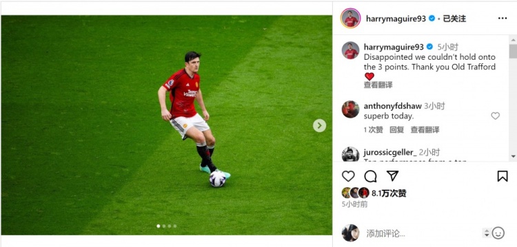 曼联中卫马奎尔此役踢满全场,赛后他在社交媒体上晒出自己的比赛照片,并写道:“很失望未能保住三分。谢谢你,老特拉福德❤️”