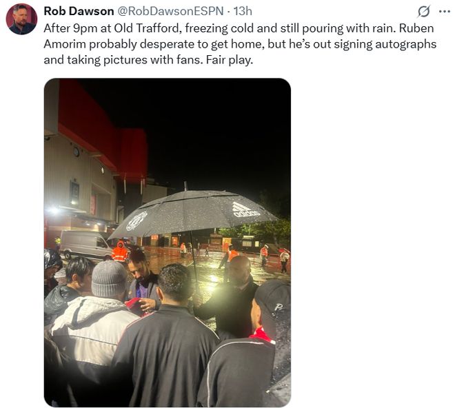 该记者表示;“晚上9点的拉特拉福德(当地时间)下着大雨,寒意刺骨。阿莫林虽然很着急回家,但仍未为球迷们签名合影,真君子!”