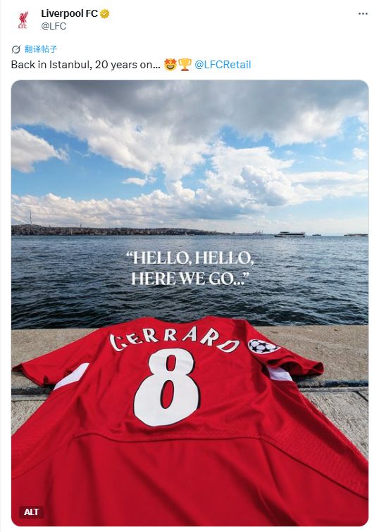 雷速体育10月1日宣 今日凌晨3:00,25/26赛季欧冠联赛阶段第2轮,利物浦将在客场挑战加拉塔萨雷。这是红军时隔20年再度来到伊斯坦布尔,赛前,利物浦官方在社交媒体上晒出了杰拉德的8号球衣,并配文“20年后重返伊斯坦布尔”。