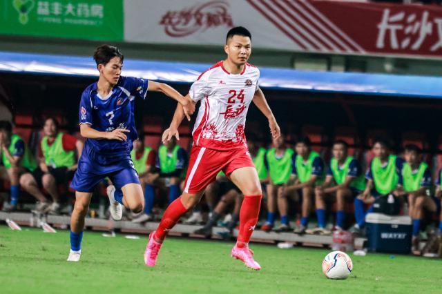 36岁的杨柯在湘超赛场踢得依然游刃有余。长沙市足协供图