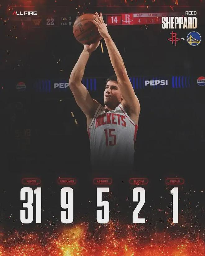 谢泼德本场得分、篮板和盖帽,均是个人NBA生涯新高。此前他最高得分是27(11月22日对阵掘金),最高篮板是7(11月17日对阵魔术),最高盖帽是1(10月22日对阵雷霆)。谢泼德是火箭队史第二年轻的30+8+5先生,仅次于申京。