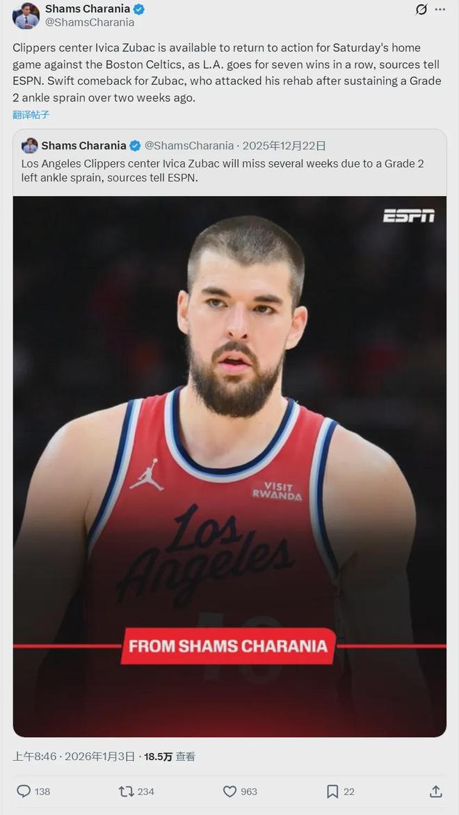 今天的消息,祖巴茨恢复神速,可以出战明天对阵凯尔特人的比赛。